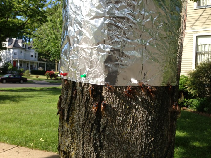 My neighbor put this aluminum barrier. It seems to work. The bugs get stuck here trying to claw their way up the tree. I just don’t understand how they manage to climb up my Car.