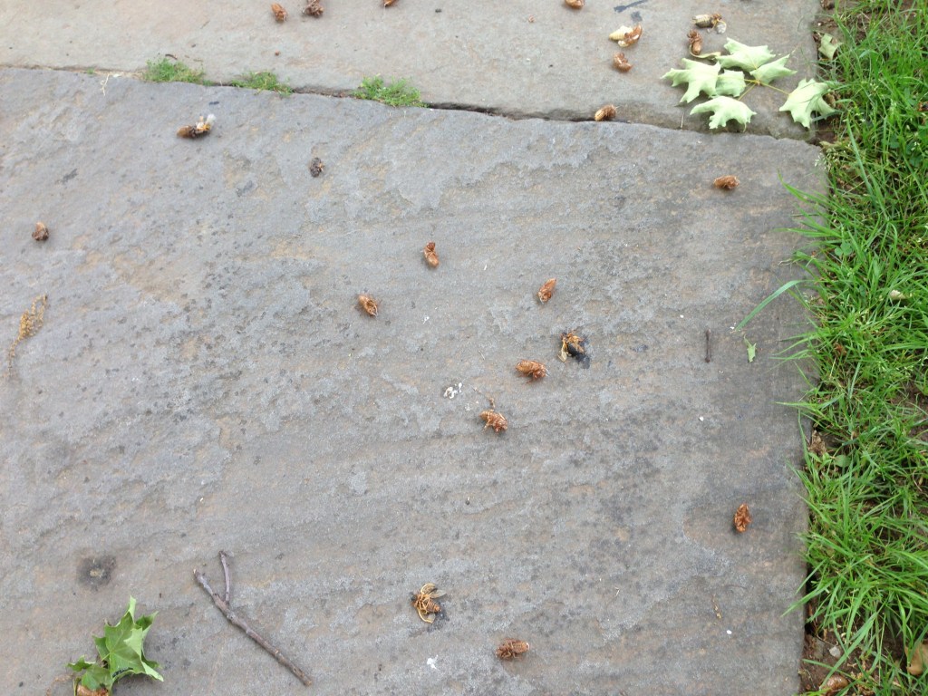 In these past three weeks, I have had five cicadas in my house and I keep a Swiffer to “mop-poke” the bugs that I find on the front stairs to my house everyday.  My dog has started to look slightly traumatized when he comes in from the back yard and my son really did when he told me that the bugs were crawling up his legs when he was playing Frisbee. He has started wearing shoes in the house. I have learned to trade in my Fit Flops for covered shoes and to walk only on treeless streets.